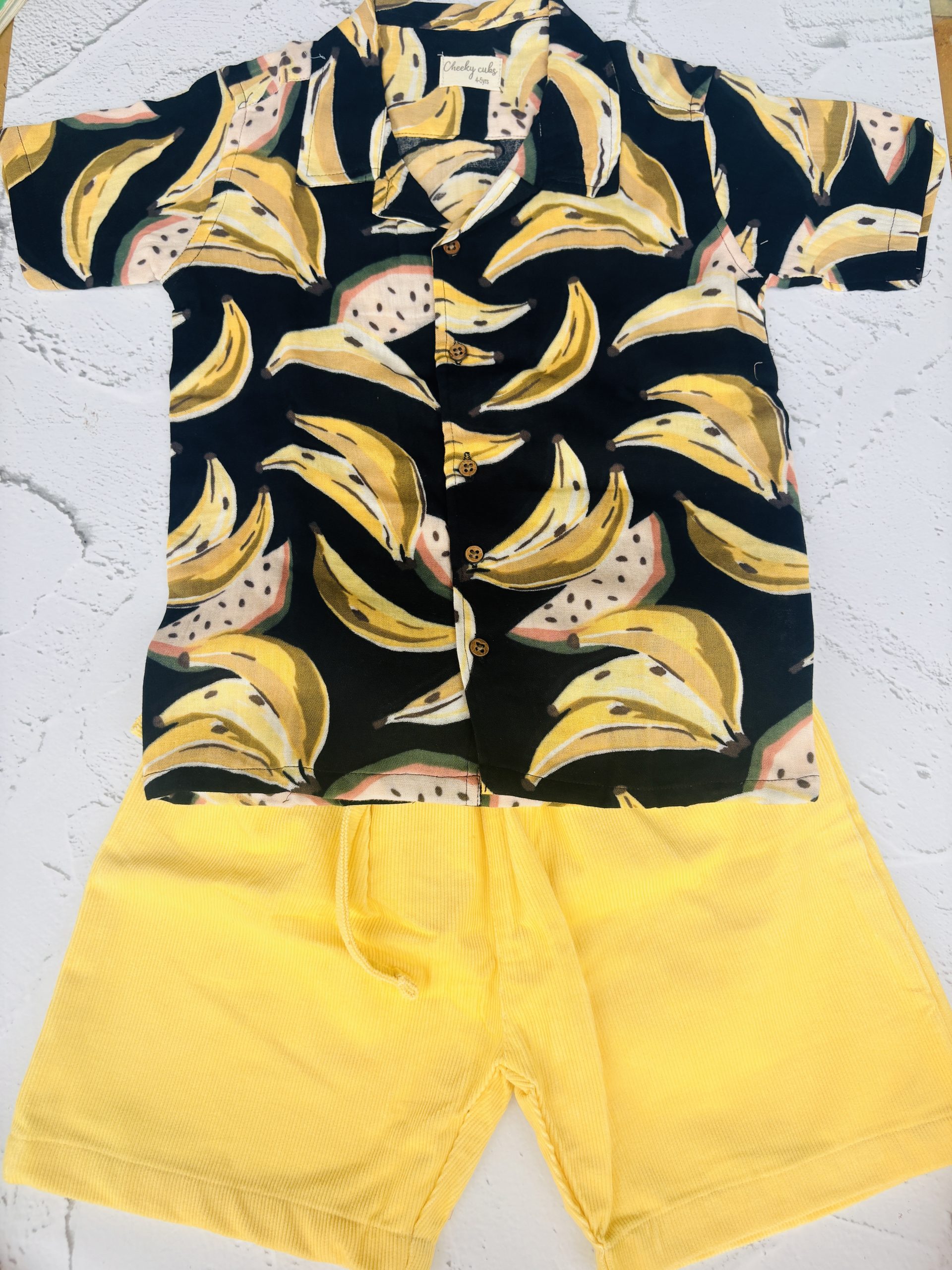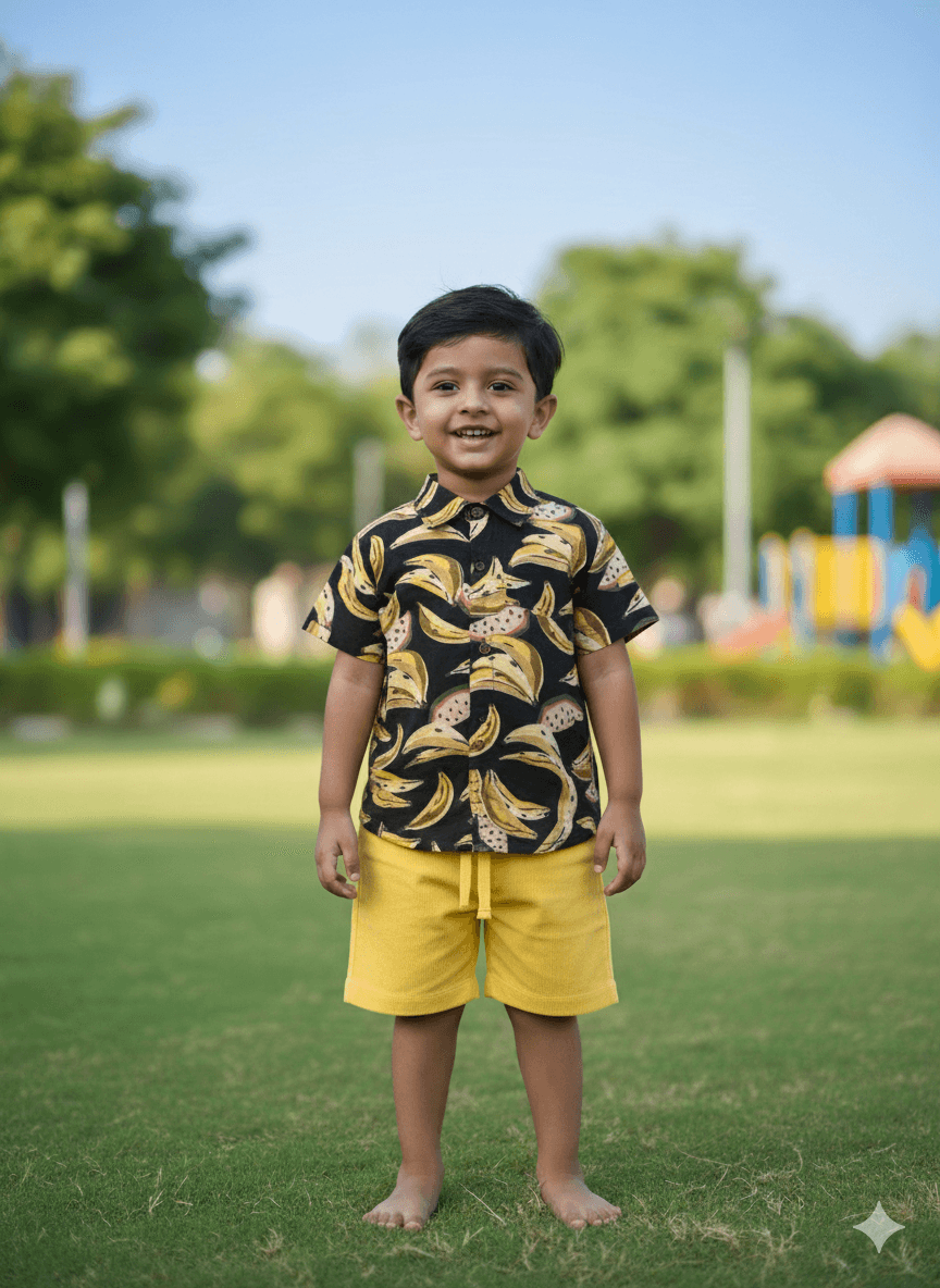 This cheerful shirt and shorts set features playful banana prints on a refreshing teal green base.