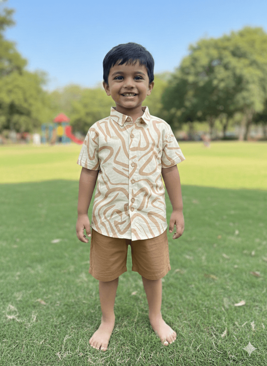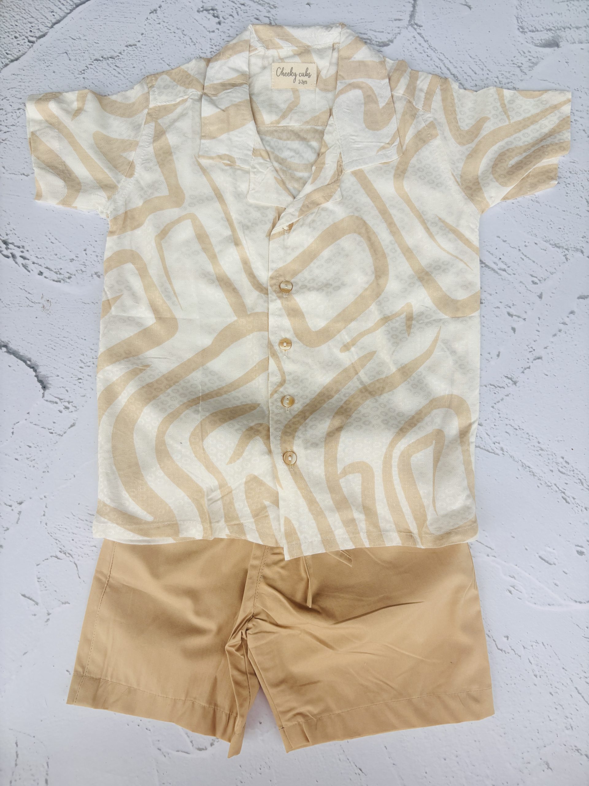 This stylish shirt and shorts set features a soft beige printed shirt paired with solid tan shorts.