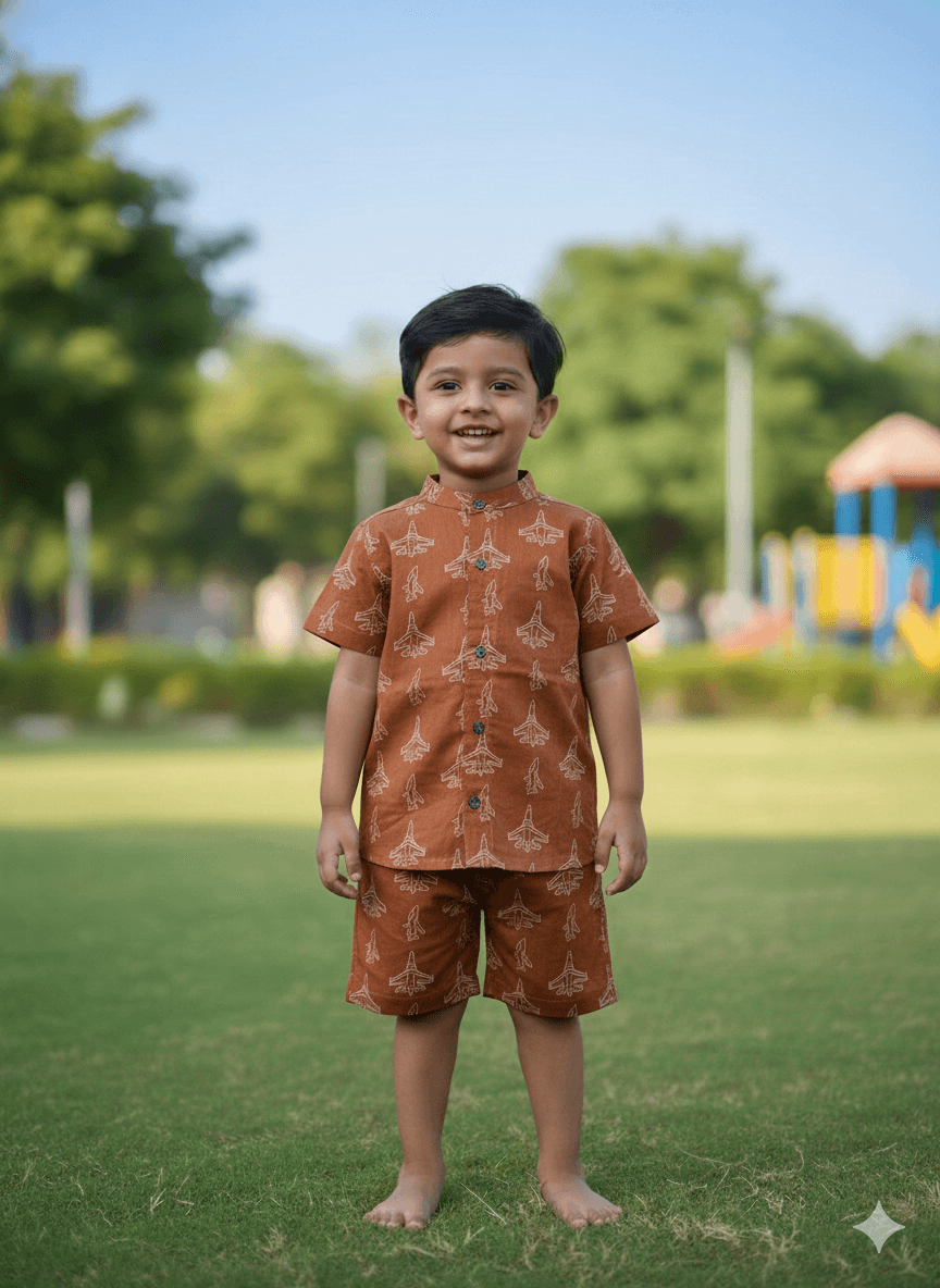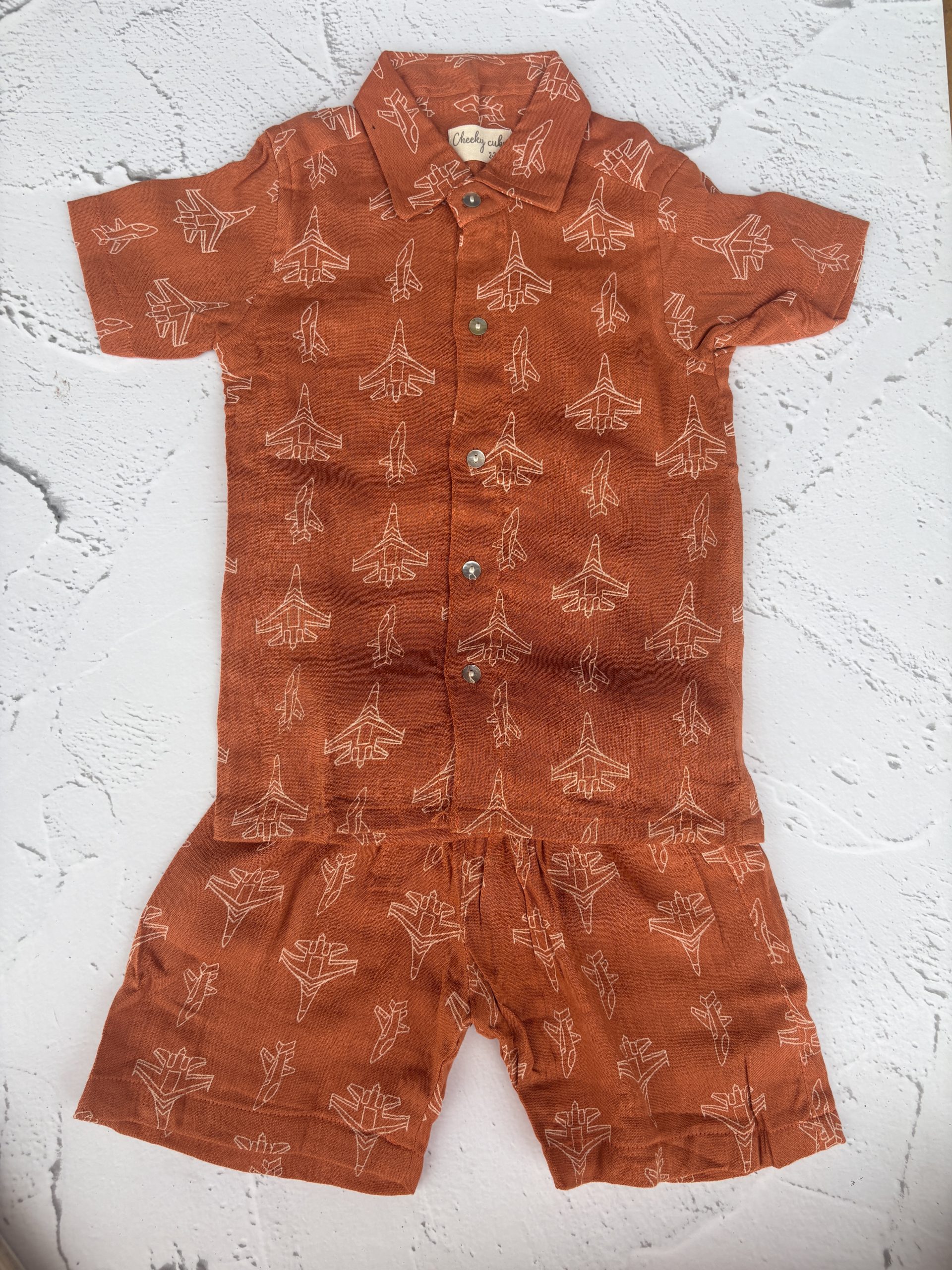 This stylish shirt and shorts set features a playful aeroplane print on a rich rust orange base.