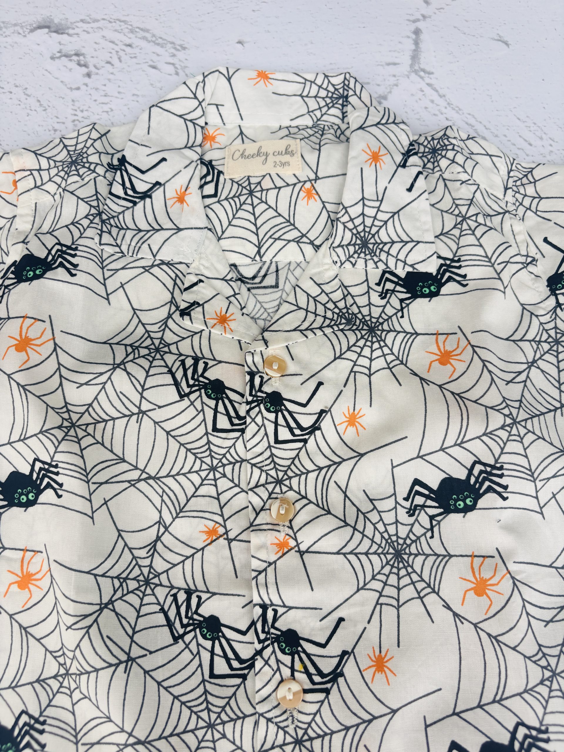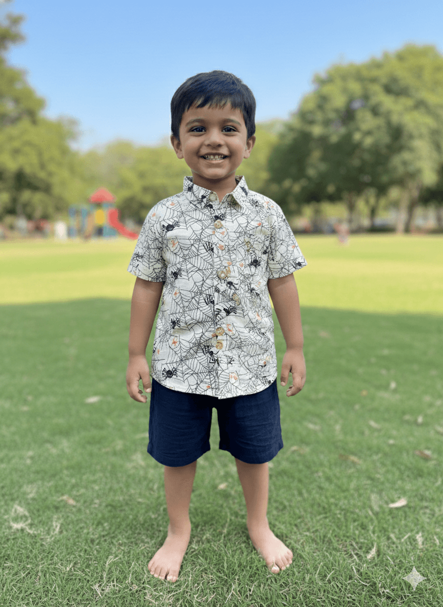 Let your little one step out in comfort and style with the Web Wonder Kids Cotton Shirt & Shorts Set. Featuring a unique spider web printed ivory shirt and classic navy shorts, this co-ord set is crafted from soft, breathable cotton fabric for all-day comfort. The button-down shirt offers a smart casual look, while the elastic-waist shorts provide flexibility and ease of movement. Ideal for daily wear, playtime, or outings, this set blends comfort, style, and playful charm.